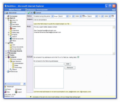 * autorisponditore per ferie con data di inizio/fine ed esclusione delle mailing lists