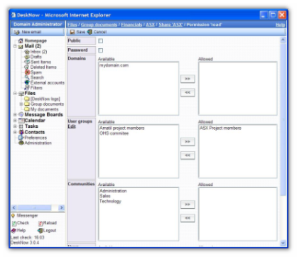 Le condivisioni possono essere pubbliche, protette da password o nominali: agli utenti selezionati, comunità o gruppi. Differenti permessi (lettura, scrittura, cancellazione, ecc.) possono essere assegnati a oggetti differenti.