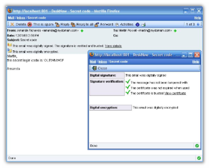 Le mail cifrate inviate usando lo stesso protocollo da altri server DeskNow o client di posta compatibili con S/MIME vengono decriptate e visualizzate nell'interfaccia web